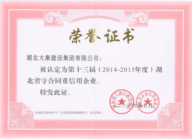 2016年10月17日我們湖北大集建設(shè)集團有限公司很榮幸被湖北省工商行政管理局和湖北省企業(yè)信用促進會聯(lián)合評定為2014—2015年度“守合同重信用企業(yè)”,這也是今年大集地區(qū)唯一一家獲評企業(yè)。