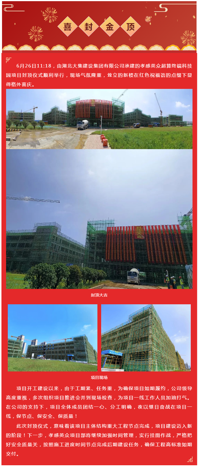 喜封金頂|孝感英眾超算終端科技園項(xiàng)目封頂大吉!