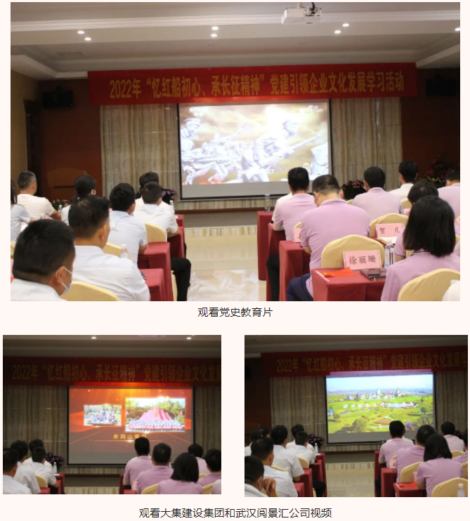 為慶祝建黨101周年,進(jìn)一步推進(jìn)黨史學(xué)習(xí)教育,增強(qiáng)隊(duì)伍凝聚力、向心力與戰(zhàn)斗力,湖北大集建設(shè)集團(tuán)聯(lián)合武漢閱景匯公司于6月16日上午共同開展2022年“憶紅船初心,承長(zhǎng)征精神”黨建引領(lǐng)企業(yè)文化發(fā)展學(xué)習(xí)活動(dòng),兩家公司的全體黨員、入黨積極分子以及中高層領(lǐng)導(dǎo)、優(yōu)秀骨干員工參加了學(xué)習(xí),會(huì)議由湖北大集建設(shè)集團(tuán)黨支部書記徐遠(yuǎn)征主持。