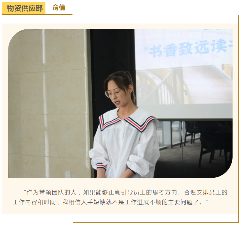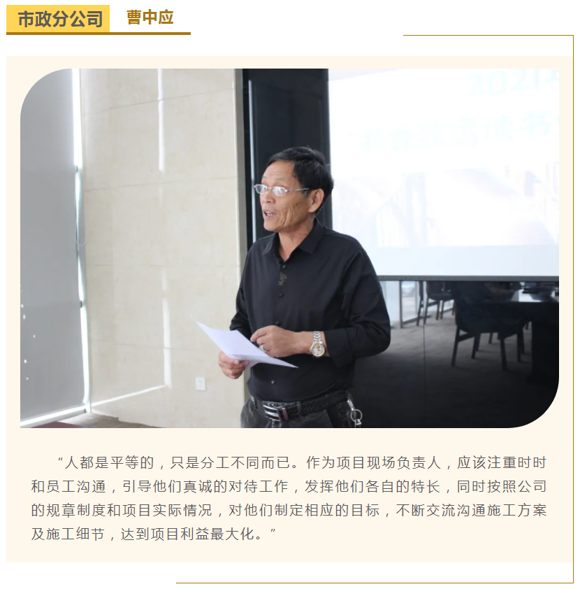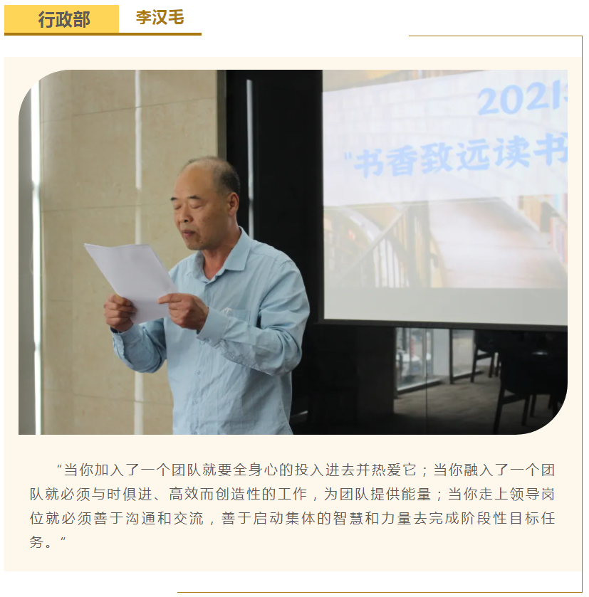 此次中高層領(lǐng)導(dǎo)共讀并分享的書(shū)籍是《麥肯錫團(tuán)隊(duì)管理法》,集團(tuán)公司七位部門負(fù)責(zé)人依次上臺(tái),結(jié)合各自的實(shí)際工作、管理經(jīng)驗(yàn)等,對(duì)書(shū)中的觀點(diǎn)進(jìn)行闡述與分析。在思想交流碰撞中,各位部門負(fù)責(zé)人進(jìn)一步加深了對(duì)團(tuán)隊(duì)管理的認(rèn)識(shí),反思了自己在部門管理中存在的問(wèn)題,了解了更多的管理細(xì)節(jié),學(xué)習(xí)了更有效的管理方法,為今后更好地完成日常管理工作打下了堅(jiān)實(shí)的基礎(chǔ)。