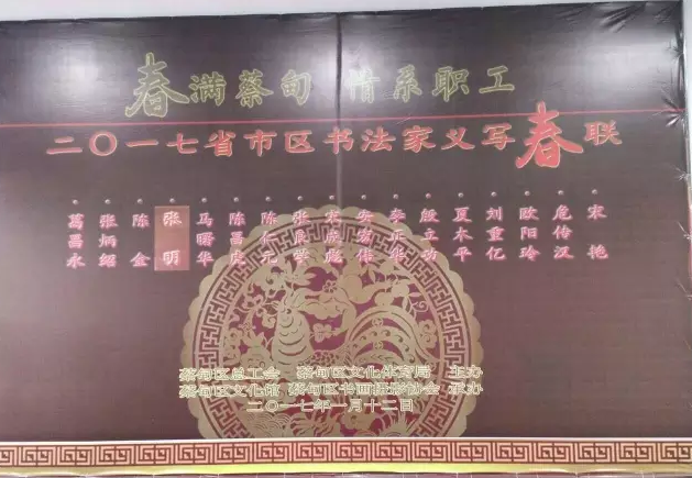 元月12日上午,在雞年新春即將來臨之際,蔡甸區(qū)總工會(huì)組織省市區(qū)書法協(xié)會(huì)書法家在區(qū)總工會(huì)工人活動(dòng)中心開展《春滿蔡甸·情系職工》2017省市區(qū)書法家義寫春聯(lián)、送祝?;顒?dòng)。區(qū)總工會(huì)、文體局相關(guān)領(lǐng)導(dǎo)、省市區(qū)著名書法家張良學(xué)、陳昌虎、宋成彪等出席了此次活動(dòng),集團(tuán)公司人事行政部吳志勇、周仟應(yīng)邀參加了該活動(dòng)。