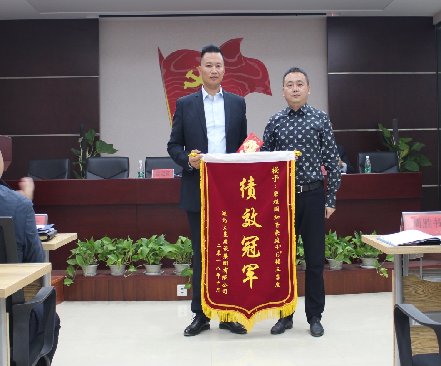 隨后,集團(tuán)董事長(zhǎng)徐濤為此次績(jī)效考評(píng)中的冠軍項(xiàng)目——碧桂園4#、6#項(xiàng)目部頒發(fā)錦旗和獎(jiǎng)金。