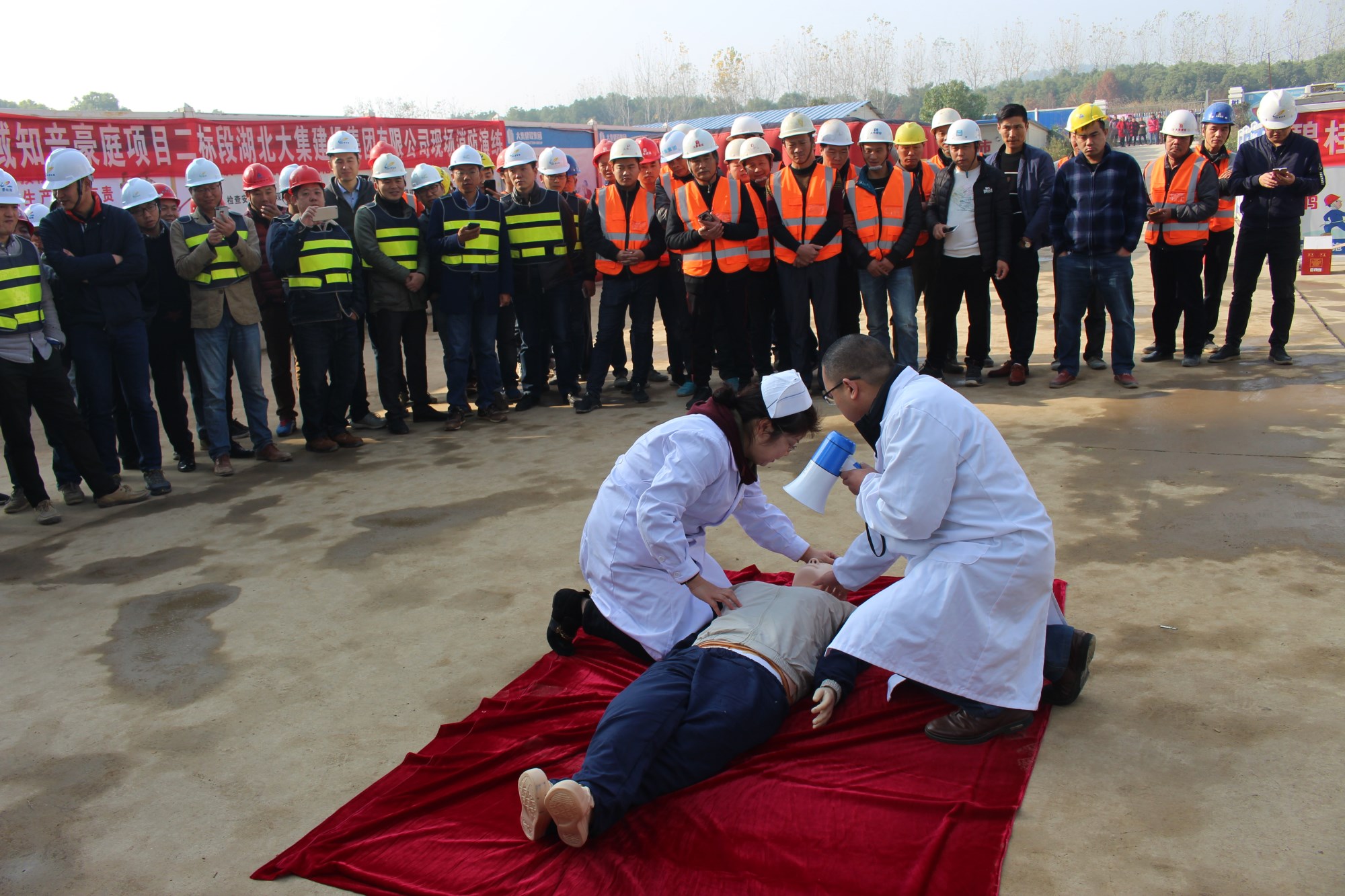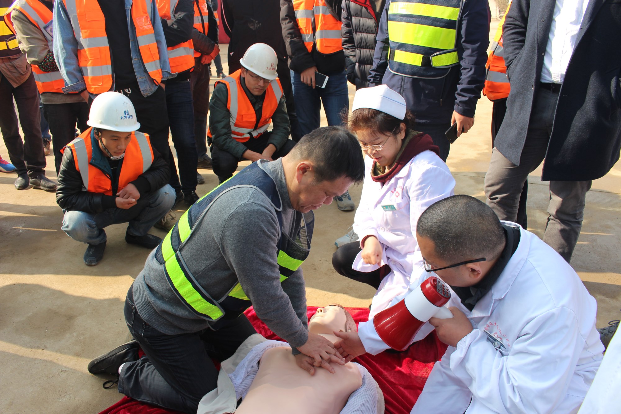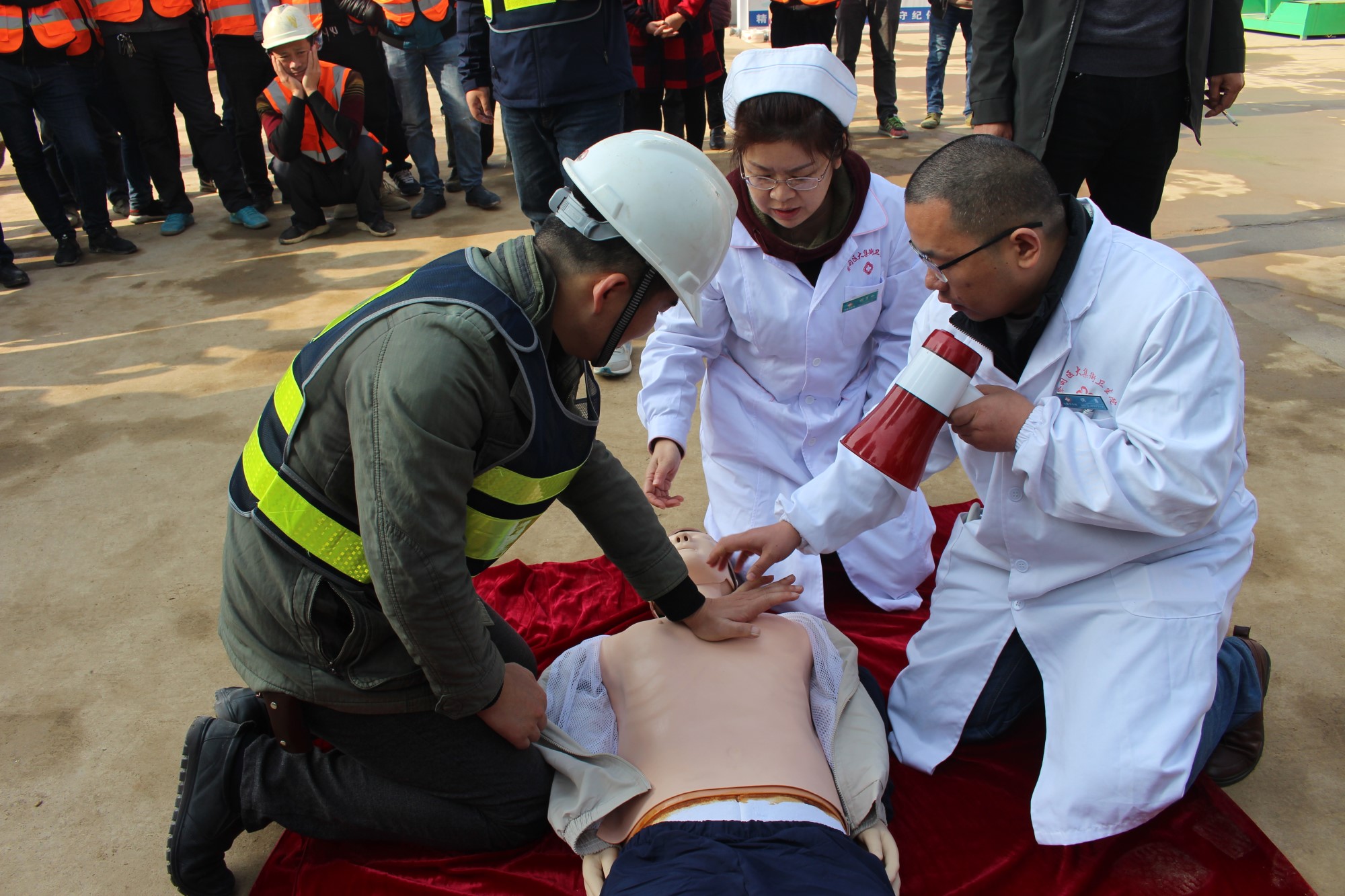 本次演習的第一個項目是心肺復蘇,由蔡甸區(qū)大集街衛(wèi)生院為現(xiàn)場參與人員講解,衛(wèi)生院醫(yī)生借助假人模型,生動形象地為大家講解了如何在現(xiàn)場進行心肺復蘇,強調(diào)了心肺復蘇的方法及要點。大家興趣濃厚,聽得認真,看得仔細,將 “心肺復蘇”要領(lǐng)熟記于心。講解結(jié)束后,衛(wèi)生院醫(yī)護人員還手把手指導大家進行實際操作,糾正錯誤的操作,并給予說明、講解和正確的示范。