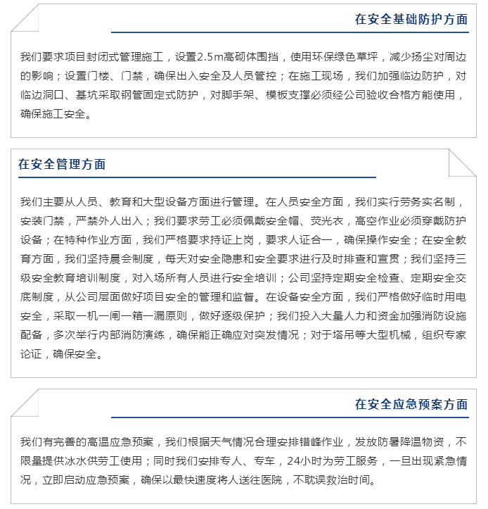 抓工程技術(shù),必須一絲不茍;抓工程進(jìn)度,必須一天不讓;抓工程質(zhì)量,必須一點情面不講;抓工程安全,必須一刻也不放松。這四個必須是集團公司精益求精、鑄造精品的法寶。未來,集團公司將繼續(xù)將安全作為警鐘紅線,將品質(zhì)作為立業(yè)之本,全力做好每一個工程項目!