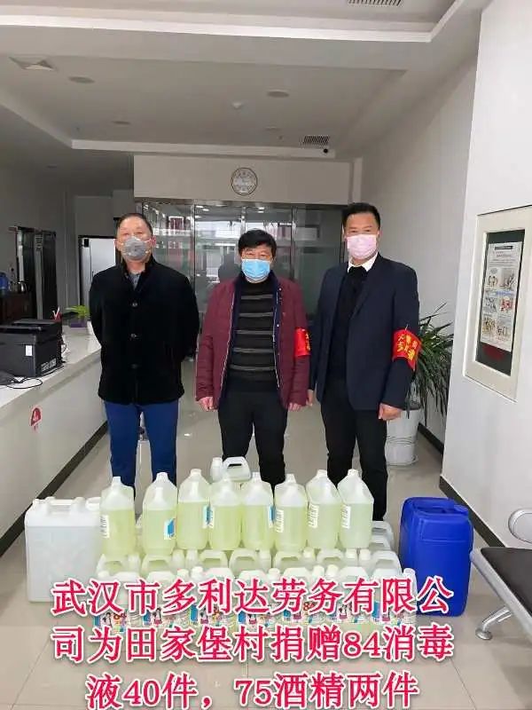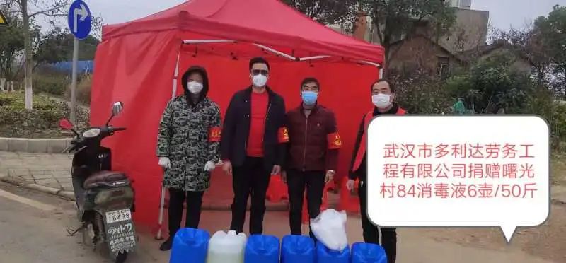 2、疫情形勢(shì)嚴(yán)峻,三位周總想法設(shè)法籌備40件84消毒液、兩大件酒精捐給田家堡村,采買300斤84消毒液捐贈(zèng)給曙光村,用于支援抗疫工作;