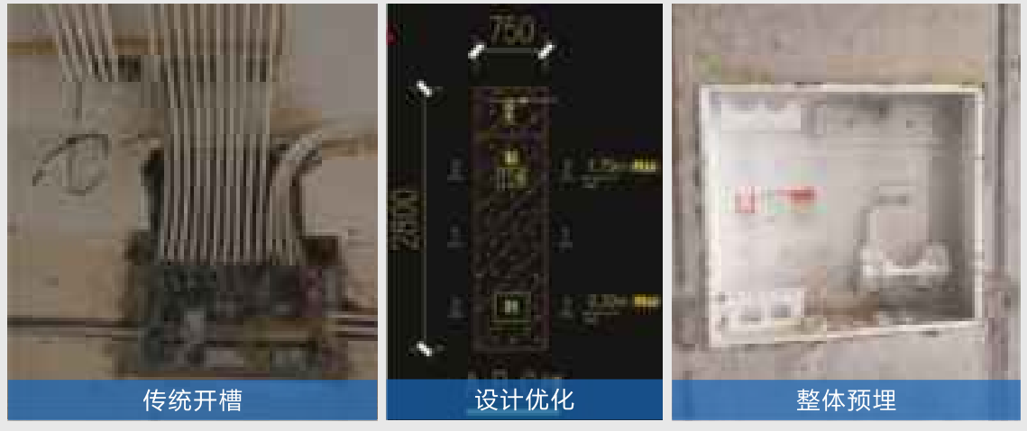 強弱電箱原圖紙在砌體上開槽后埋線盒子,再進行用砂漿修補,這樣在工人施工過程中容易鑿斷或者震裂砌墻,后期修補因砂漿過厚也會引起面層開裂。為確保質(zhì)量,經(jīng)過設(shè)計優(yōu)化,增加構(gòu)造柱預(yù)埋線管及電箱,這樣不但解決開裂問題,加快了施工進度,大大消除了質(zhì)量風險。