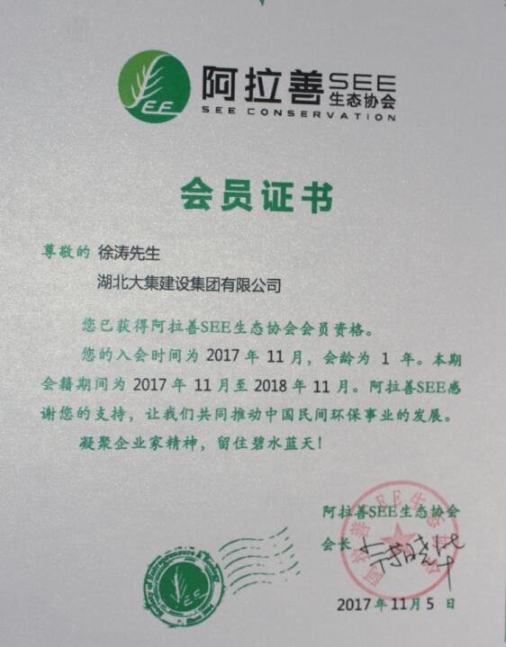2017年11月,集團(tuán)董事長(zhǎng)徐濤攜湖北大集建設(shè)集團(tuán)加入阿拉善SEE生態(tài)協(xié)會(huì),正式成為阿拉善SEE會(huì)員,與各界熱心環(huán)保的社會(huì)人士共同推動(dòng)民間環(huán)保事業(yè)的發(fā)展,努力為阿拉善沙漠筑起最美的防護(hù)墻!